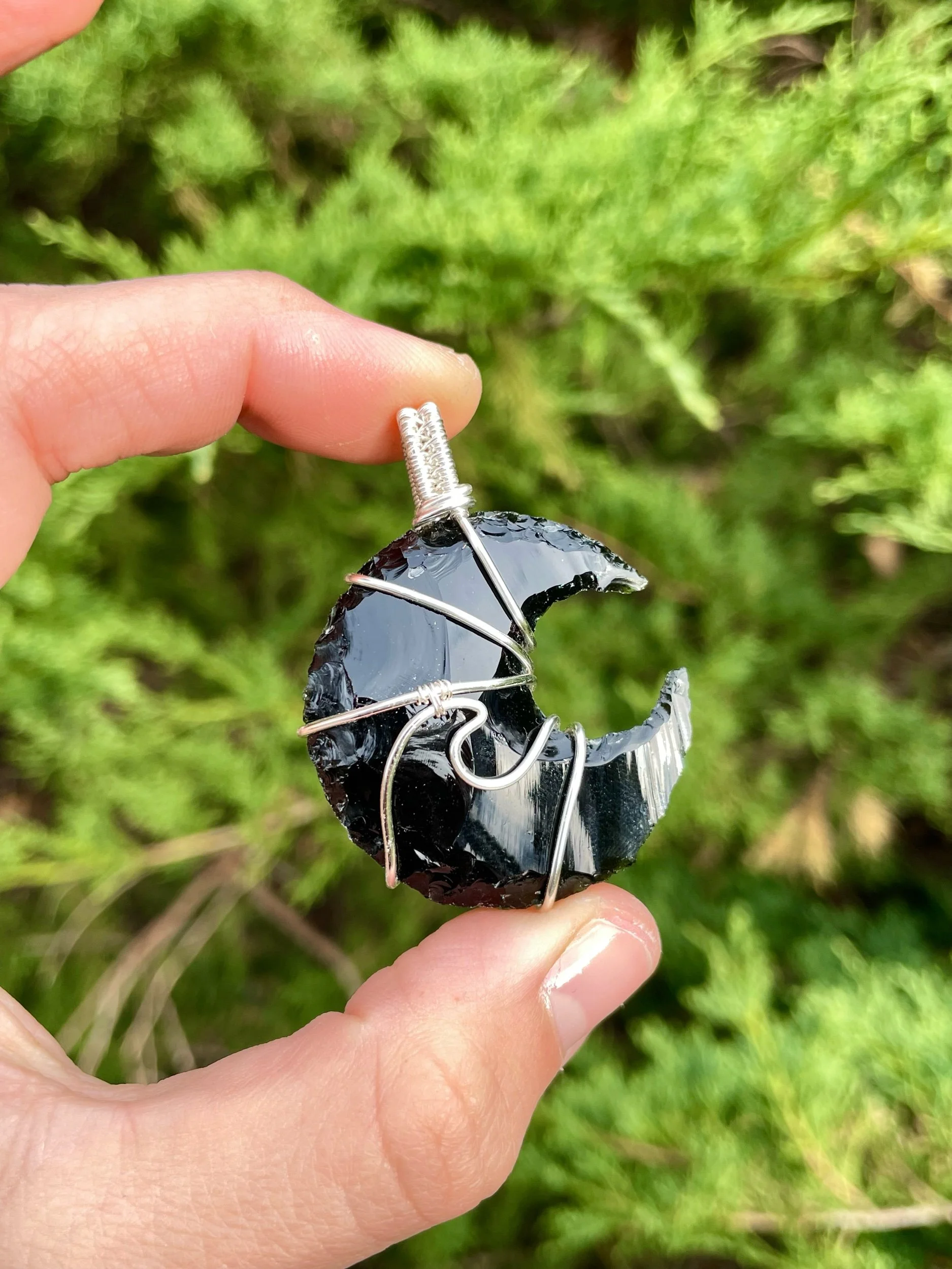 This obsidian moon has been lovingly wrapped in silver plated wire.