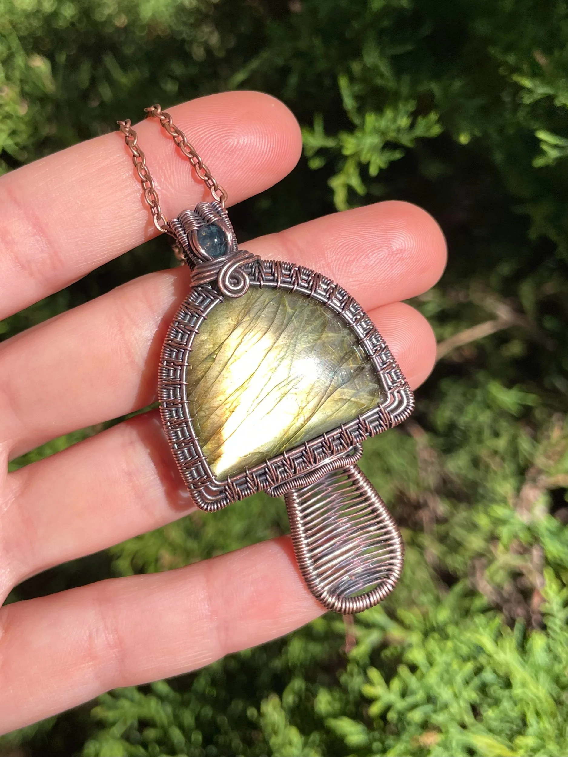 This labradorite has been intricately wrapped in oxidized copper wire with a small sapphire in the shape of a mushroom.