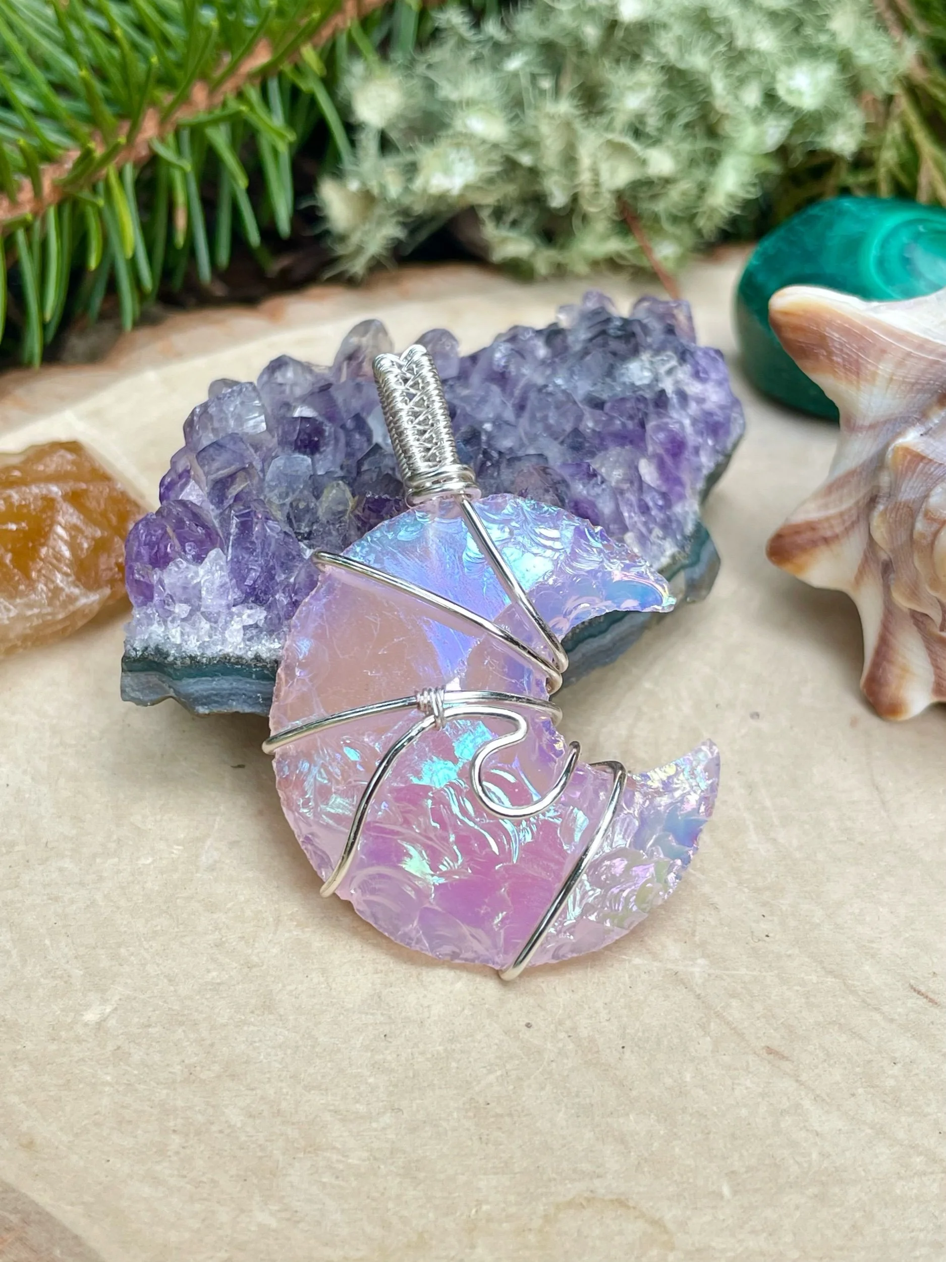 This opalite moon has been lovingly wrapped in silver plated wire.