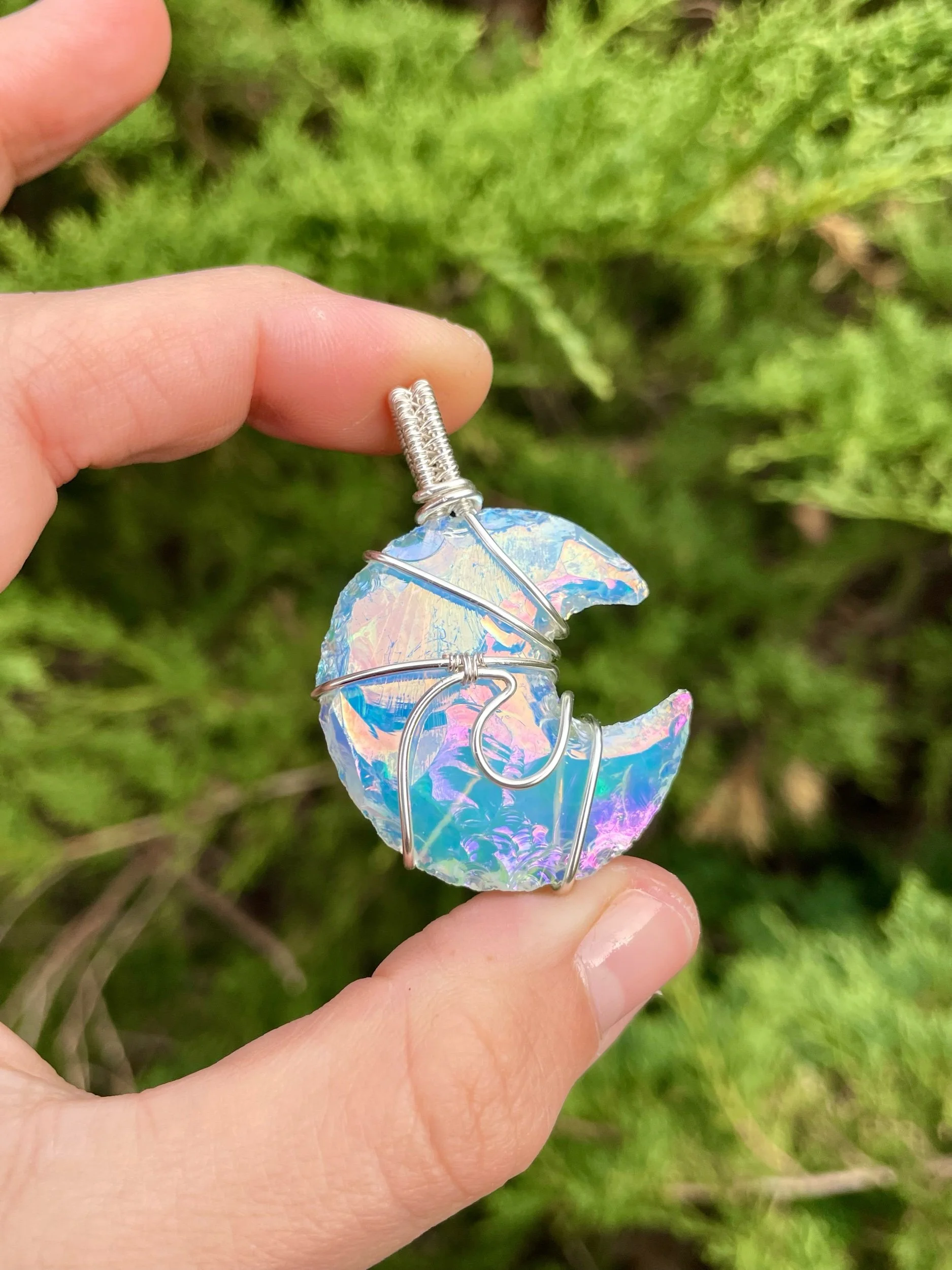 This opalite moon has been lovingly wrapped in silver plated wire.