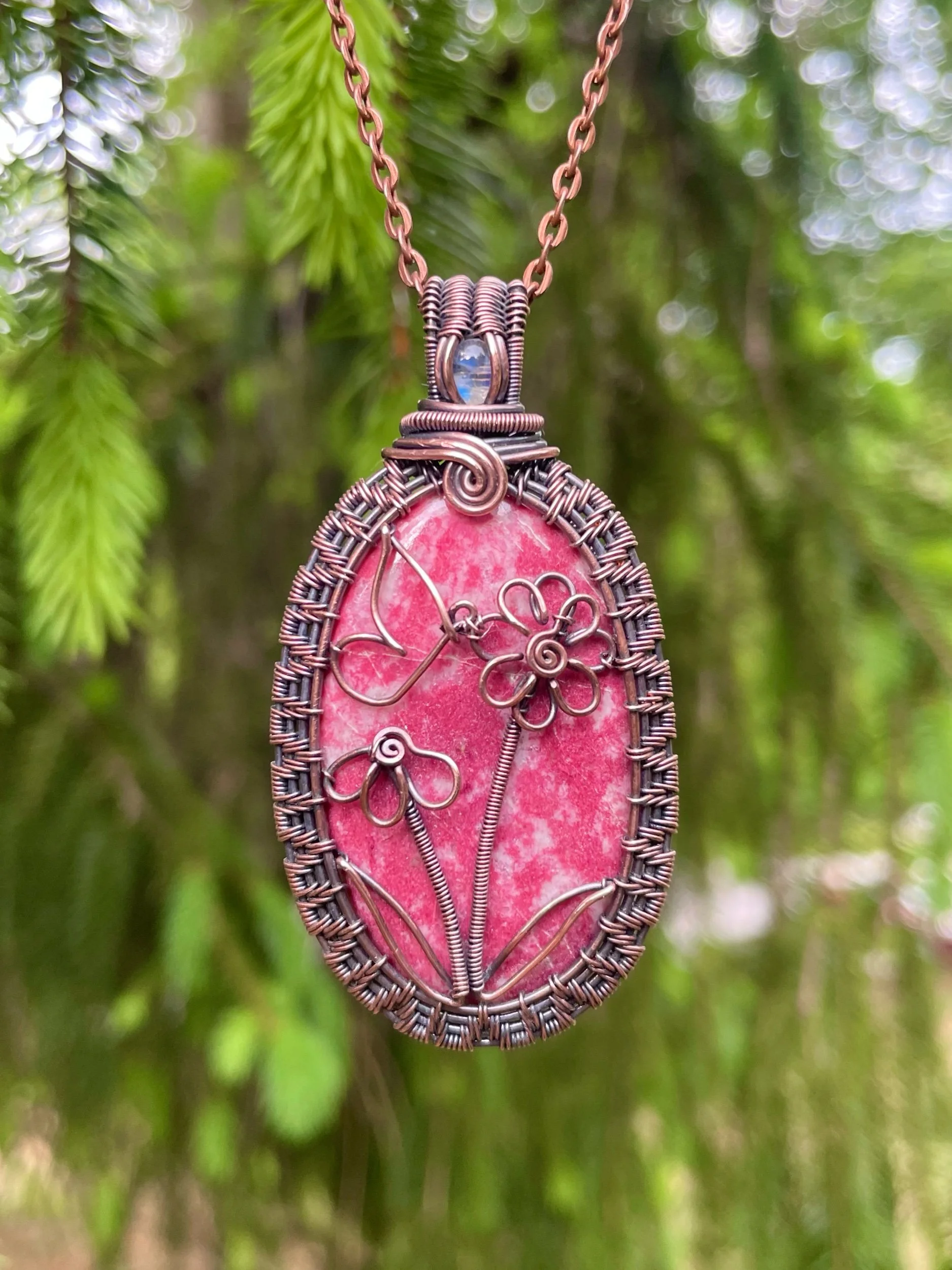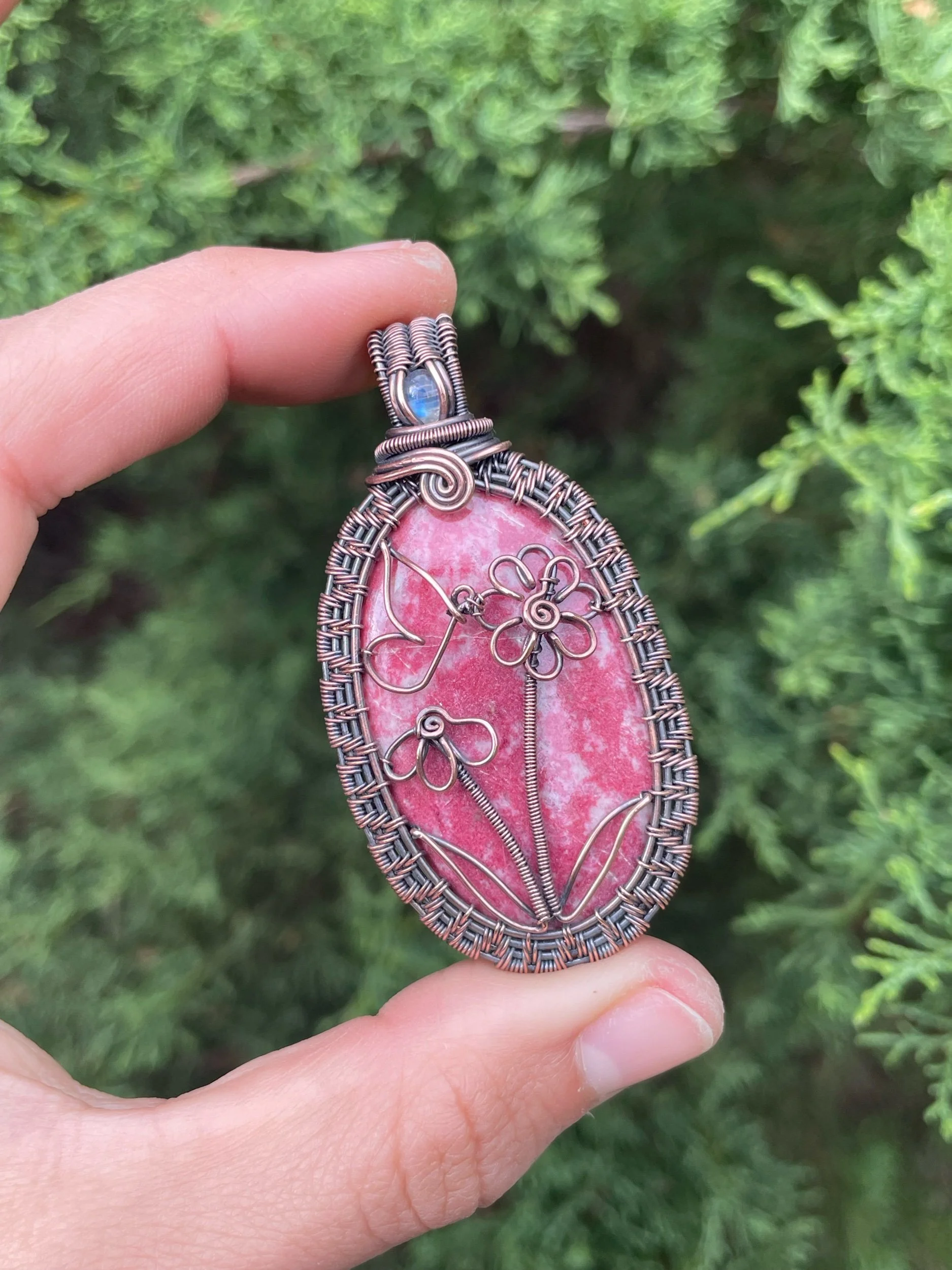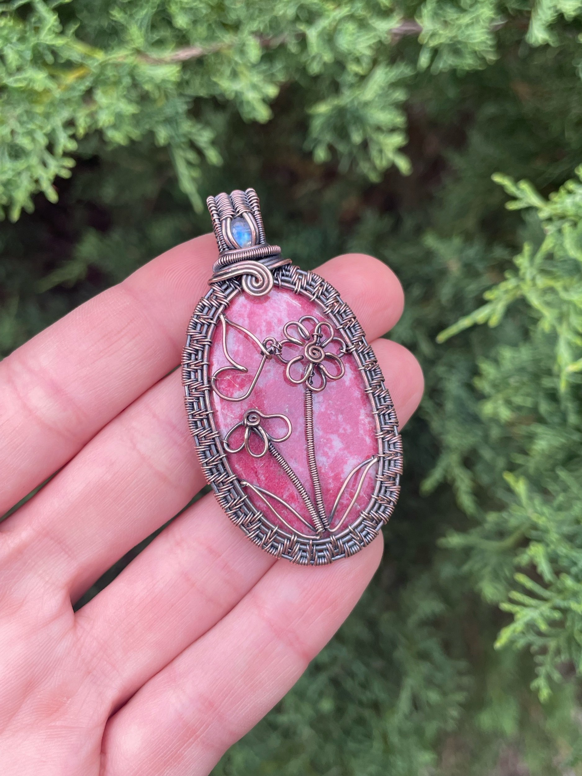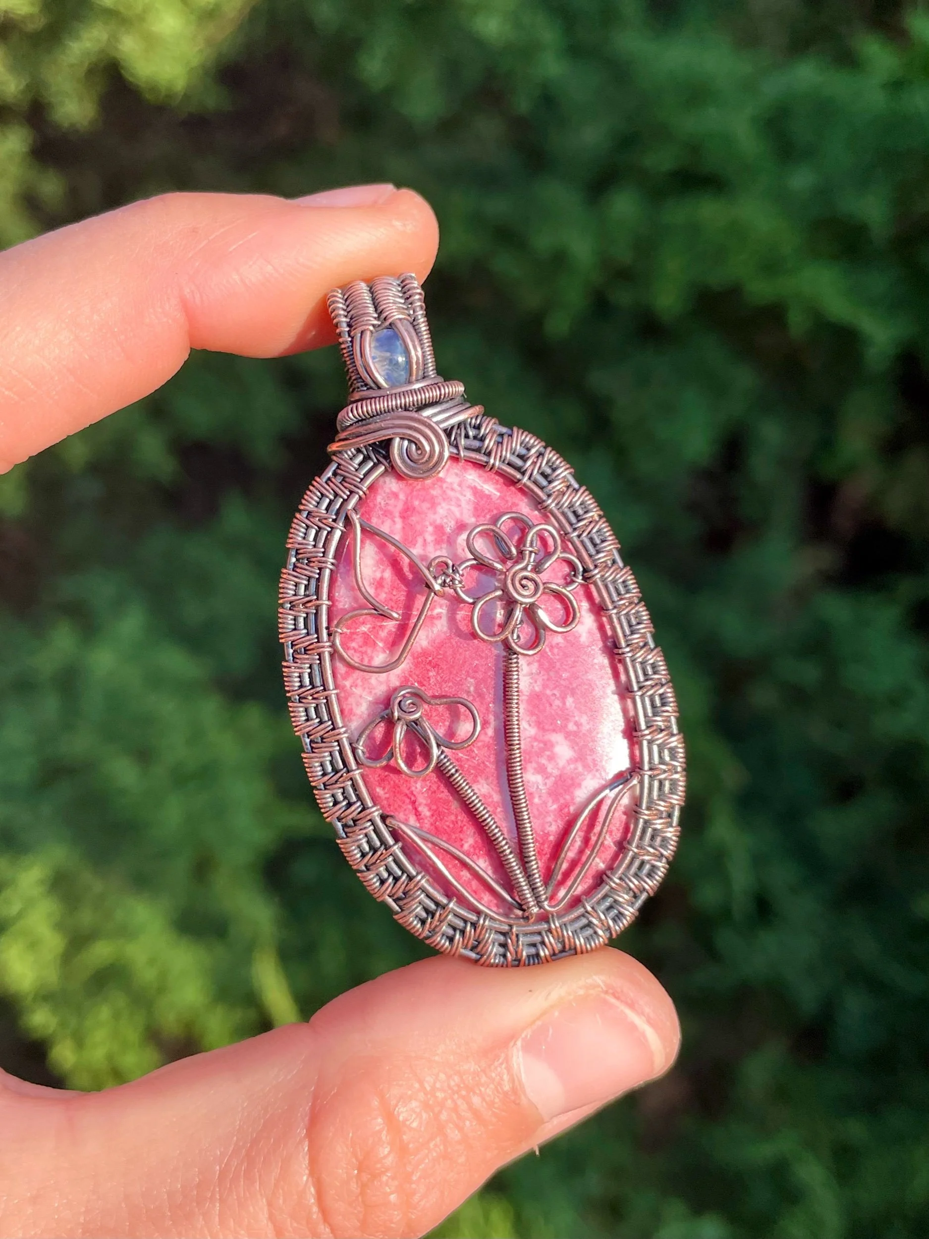 This pink thulite cabochon has been lovingly wrapped in oxidized copper wire with a small moonstone. It features two wire flowers and a butterfly.